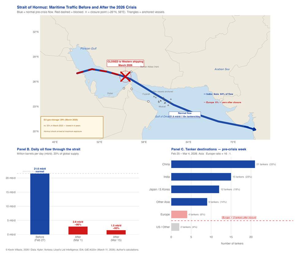 The closure of the Strait of Hormuz in early March 2026 revealed a vulnerability Europe believed it had already solved. Following a joint U.S.–Israeli strike on Iranian nuclear facilities on February 28, Iran’s Revolutionary Guard declared effective control of the strait. Oil traffic collapsed almost immediately. As shown in the graphic below, daily flows fell from roughly 21.6 million barrels per day to fewer than 3 million within days, leaving hundreds of vessels anchored in the Gulf of Oman and halting Western-bound shipments.