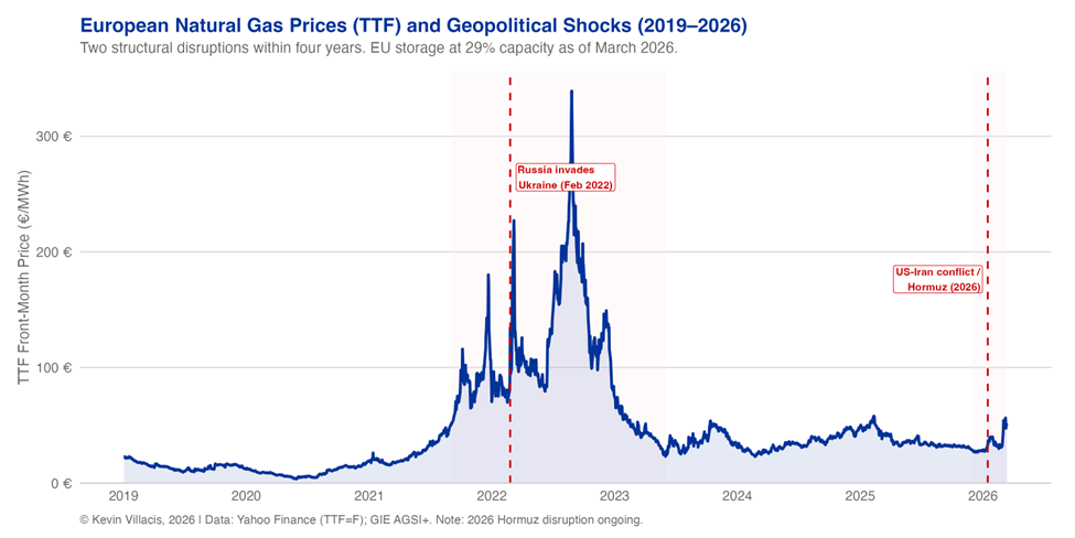 The price response was immediate but familiar. The next chart places the shock in historical perspective by tracing European natural gas prices since 2019. The Russian invasion of Ukraine in 2022 produced the first major disruption, sending TTF prices to nearly €340/MWh. The Hormuz crisis represents the second major geopolitical shock to European energy markets in less than four years. While prices have not yet reached the extremes observed in 2022, the structural context is less favourable: EU gas storage stood at roughly 29% of capacity in March 2026, well below the levels observed in early 2023.