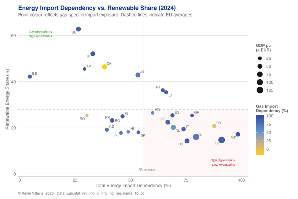 The broader structure of Europe’s energy system helps explain why this matters. The scatter plot below compares energy import dependency with renewable energy shares across EU member states. Most countries remain clustered in the quadrant combining high import dependence with relatively modest renewable penetration. A few cases (such as Sweden and Estonia) display the opposite pattern, but they remain exceptions rather than the rule.