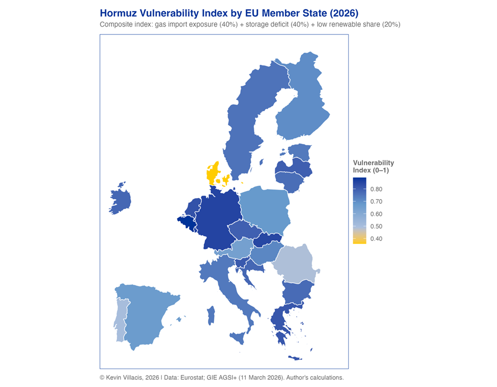This structural heterogeneity becomes clearer when mapped across the continent. The map below presents a composite Hormuz vulnerability index combining gas import exposure, storage deficits, and renewable capacity. Several of the EU’s largest economies, including Germany, France, Belgium, and the Netherlands, emerge among the most exposed. By contrast, countries with stronger renewable deployment or lower import dependence, such as Portugal and Denmark, appear significantly less vulnerable.