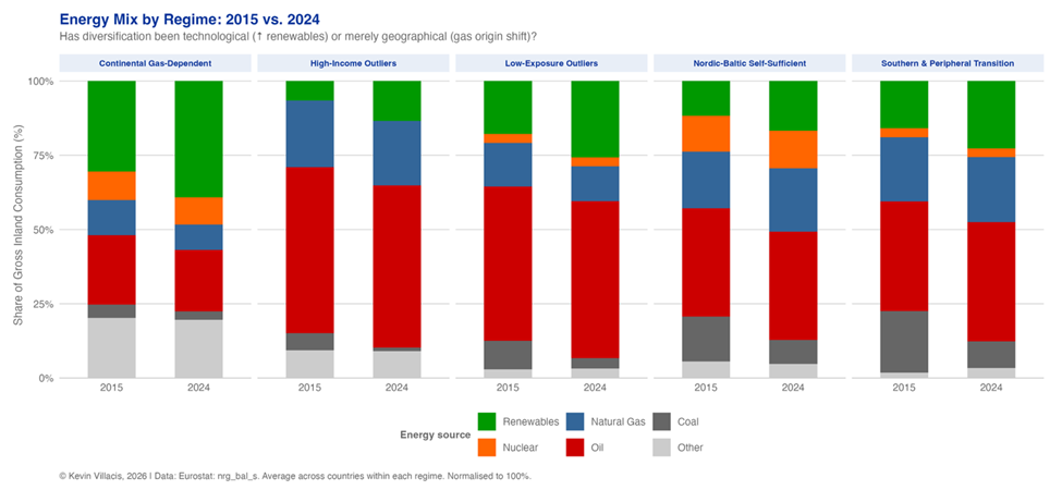 The persistence of this vulnerability reflects the nature of Europe’s energy transition over the past decade. As shown in the chart below, renewable energy shares increased across all country groups between 2015 and 2024. Yet the expansion was not large enough to fundamentally alter the continent’s reliance on imported fossil fuels. Coal declined, but oil and gas remained dominant across most regimes.