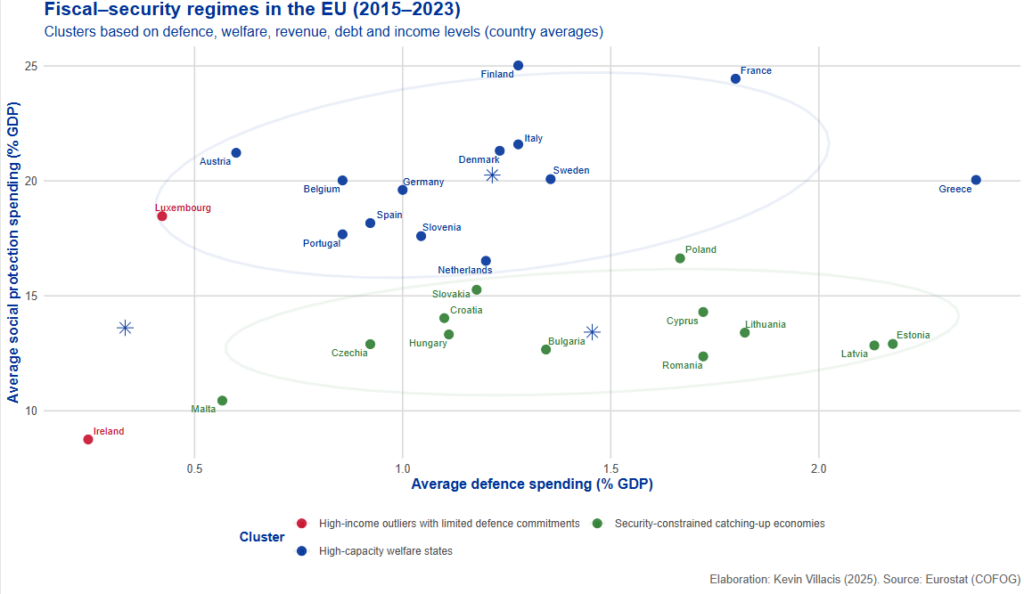 These divergent trajectories suggest that defence and welfare outcomes cannot be understood by looking at countries in isolation. Instead, they reflect deeper structural conditions. To capture these, the analysis groups European countries into fiscal security regimes based on defence effort, welfare generosity, revenue capacity, Maastricht debt levels, and income per capita. This approach shifts the focus from short-term political choices to the fiscal environments within which governments responded to the security shock.