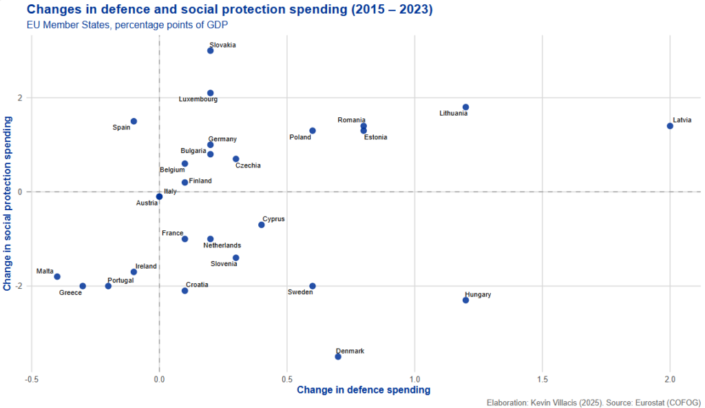 Levels alone, however, can be misleading. Figure 2 therefore examines how countries adjusted between 2015 and 2023, a period that spans both the post-Donbas security environment and the invasion of Ukraine. Here, a more nuanced picture emerges. Several countries increased defence spending while social protection stagnated or declined slightly, including parts of Central and Eastern Europe and some large Western economies. At the same time, countries such as Germany, Poland, and Lithuania managed to raise defence expenditure without cutting social spending. Thus, trade-offs do exist, but they are selective rather than universal.