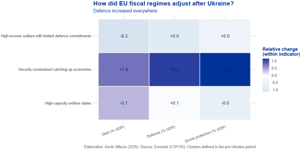 To reinforce this idea, Figure 4 shows how these regimes have adjusted after 2022. Defence spending rose across all groups. High-capacity welfare states absorbed this increase with little erosion of social protection and without major debt accumulation. Catching-up economies relied more on borrowing while modestly expanding social spending. High-income outliers adjusted only marginally. What changed was not Europe’s social model, but the channel and intensity of fiscal adjustment within each regime.